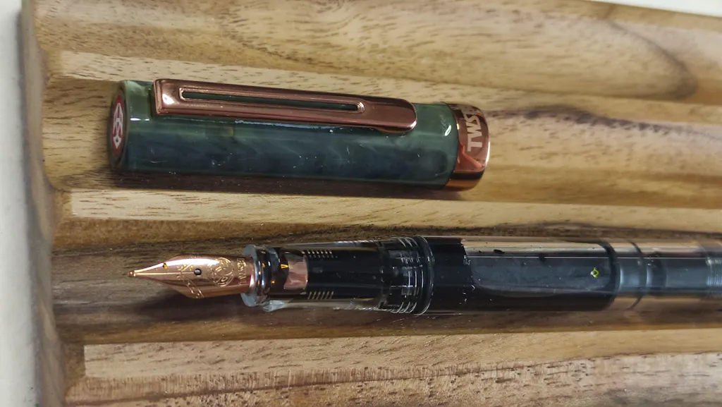 This TWSBI Eco Serpentine and bronze fountain pen has a green and golden color mix cap and piston knob, finished with bronze color coated metal parts.